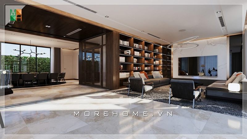 kệ sách liền ngay phòng khách được thiết kế hiện đại từ chất liệu gỗ óc chó cao cấp sử dụng như một vách ngăn tiện lợi, sáng tạo của biệt thự, nhà phố