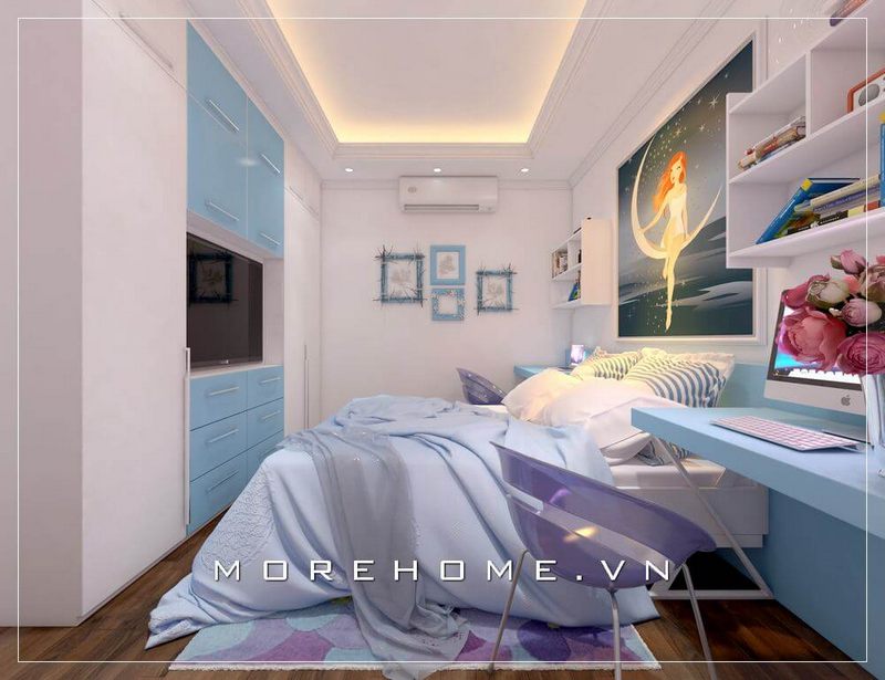 Thiết kế phòng ngủ trẻ em hiện đại đầy ấn tượng, gam màu trắng- xanh của nội thất mang lại cảm giác dịu nhẹ, năng động không tạo cảm giác chói mắt cho người nhìn