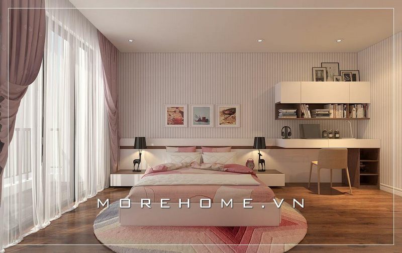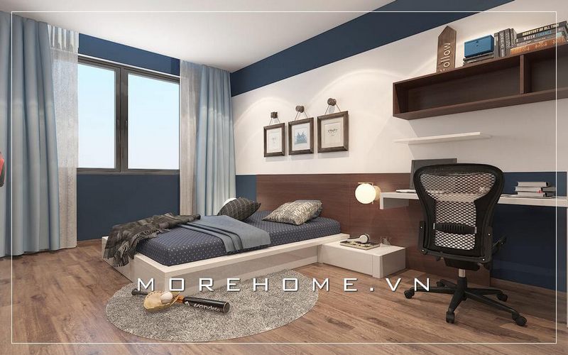 Bố trí phòng ngủ dành cho con với lối thiết kế đơn giản với nội thất giường ngủ hiện đại gỗ công nghiệp nối liền với bàn học độc đáo và tiện nghi