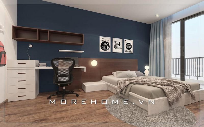 Bố trí nội thất phòng ngủ chung cư nhỏ hiện đại, khoa học, giường ngủ, tủ kệ, bàn học được sắp xếp hợp lí giúp cho căn phòng thêm thoáng rộng hơn