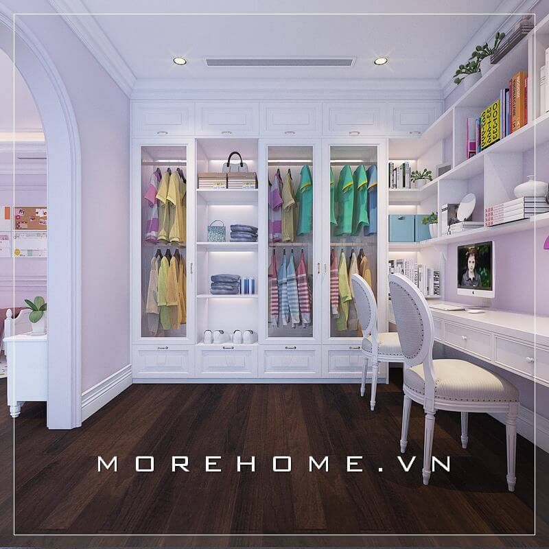 Mẫu tủ quần áo gỗ tự nhiên phun sơn trắng cao cấp kết hợp cánh kính sang trọng, lối thiết kế kịch trần mang lại cho không gian phòng ngủ bé gái thêm nhẹ nhàng và rộng thoáng hơn