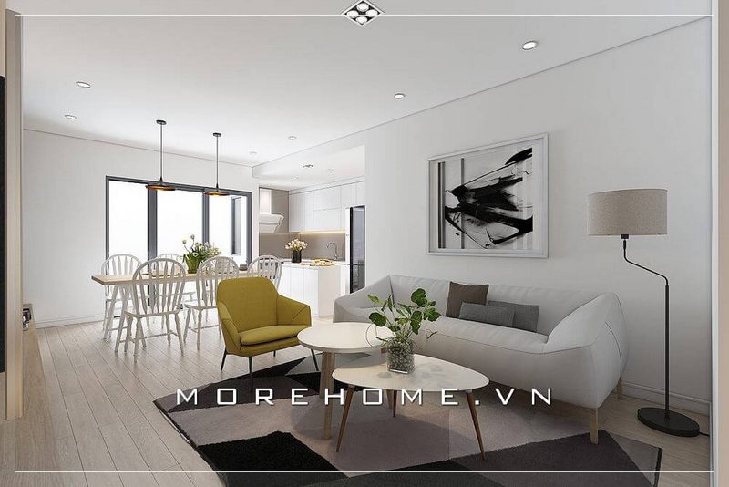 Thiết kế chung cư hiện đại,khu vực sinh hoạt chung được thiết kế liền kề, phần cửa hướng ra ban công kích thước lớn mang lại ánh sáng và không khí trong lành cho căn phòng bớt ngột ngạt