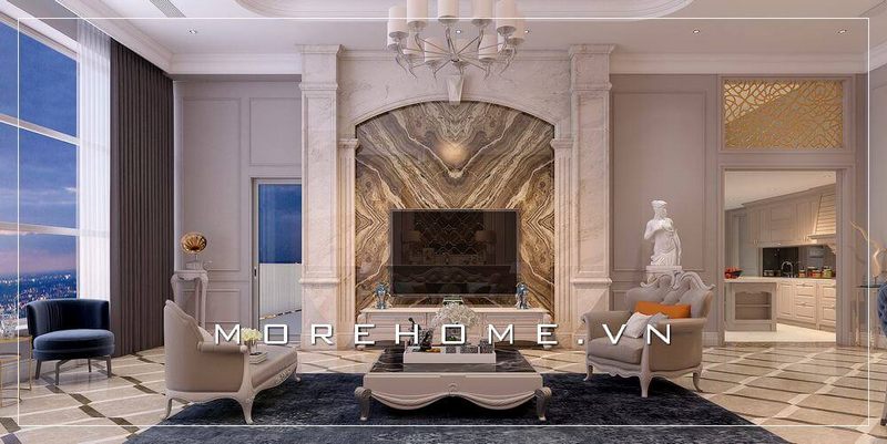 Đá ốp phòng khách đẹp kết hợp phong cách tân cổ điển trong đồ nội thất gỗ óc chó đã tạo nên vẻ đẹp độc đáo, sang trọng đặc biệt biệt thự, nhà phố.