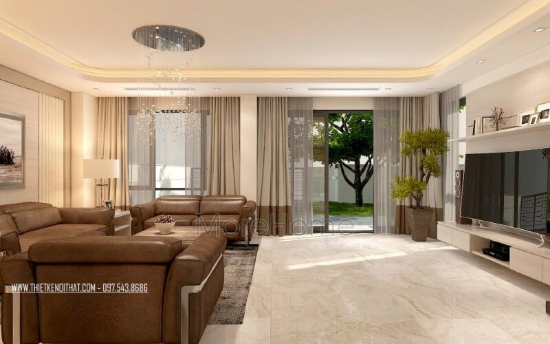 Có thể nói sofa góc là một trong những lựa chọn không thể bỏ qua cho mọi không gian đặc biệt trong thiết kế nội thất phòng khách biệt thự. Tuy nhiên cách kết hợp làm sao để tất cả tạo nên vẻ đẹp tổng hòa từ gam màu bộ sofa, kiểu dáng bàn trà. Như trong mẫu thiết kế nội thất phòng khách biệt thự này, kts Morehome đã lựa chọn chiếc bàn gỗ nguyên tấm gỗ óc chó, loại gỗ quý với vô vàn điểm mạnh, vân gỗ 3D tuyệt đẹp, gam màu độc đáo ko đơn điệu chuyển hóa từ nâu nhạt đến socola đậm hơn là tím đỏ,..