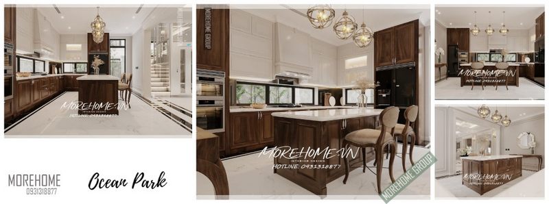 . Mẫu thiết kế phòng bếp biệt thự được trang bị tủ bếp chữ I và bàn đảo bếp tân cổ điển, được làm từ gỗ óc chó sơn bóng tự nhiên và kết hợp với mặt đá nhân tạo trắng cao cấp.
